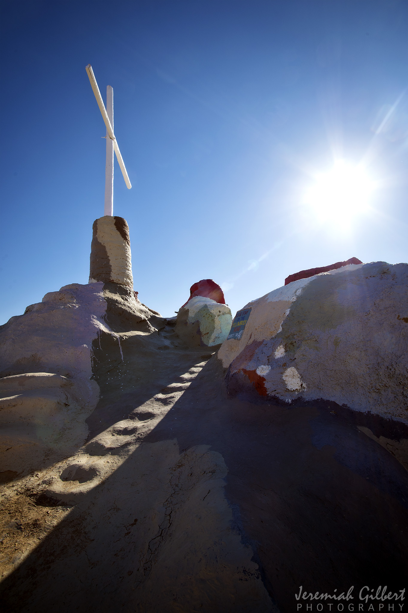 Salvation Mountain is an art installation covering a hill in the Colorado Desert, several miles from the Salton Sea, in Imperial County, California. The artwork is made from adobe, straw, and thousands of gallons of lead-free paint. Salvation Mountain was created by local resident Leonard Knight (1931–2014). It encompasses numerous murals and areas painted with Christian sayings and Bible verses. It is a popular site among the religious and the curious.