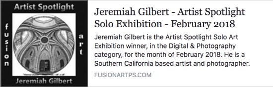 Fusion Art has selected me as their Artist Spotlight Solo Art Exhibition winner for February in the Digital & Photography category. You can find a virtual exhibition of twenty of my circular images online now. The exhibition runs the month of February: https://fusionartps.com/jeremiah-gilbert-artist-spotlight-solo-art-exhibition-february-2018/