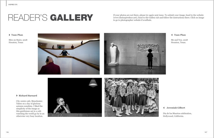 Issue 63 of Inspired Eye Magazine includes one of my Hollywood Dia de los Muertas photos (lower right) in their Reader’s Gallery. Information about the magazine can be found here: https://www.theinspiredeye.net/street-photography-magazine/