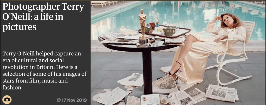 Terry O’Neill (1938 – 2019) gained renown documenting the fashions, styles, and celebrities of the 1960s. His photographs are known for capturing his subjects candidly or in unconventional settings. He died from prostate cancer at his home on November 16, 2019 at age 81. The Guardian has published a life in pictures, that can be found here: https://www.theguardian.com/artanddesign/gallery/2019/nov/17/photographer-terry-oneill-a-life-in-pictures