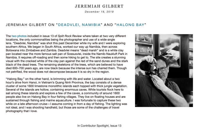 A Contributor Spotlight on my two photos included in issue 13 of Split Rock Review can be found here: https://www.splitrockreview.org/news/jeremiah-gilbert