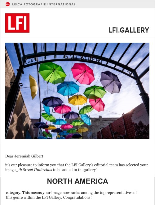 My photo “5th Street Umbrellas” was selected by Leica Fotographie International (LFI) Gallery’s editorial team to be included in their North America category. The photo was taken in downtown Redlands, California using a Leica CL with Elmarit-TL 18mm f/2.8mm lens and processed using Photoshop CC, Color Efex Pro 4, and ON1 Effects 2019. You can view LFI’s North America gallery here: https://lfi-online.de/ceemes/en/gallery/NORTH_AMERICA.html