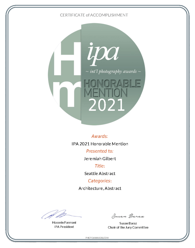 My photo “Seattle Abstract” received an Honorable Mention in this year’s International Photography Awards (IPA) in their Abstract/Architecture category. This photo was taken back in 2019 with the Nikon Z6 and processed using Photoshop CC and Silver Efex Pro.