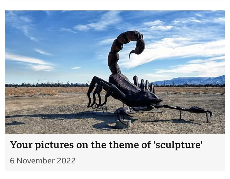 Back in late October, I submitted a photo to BBC News’ “We set the theme, you take the pictures” feature then totally forgot about it. Was reminded of this last night when I noticed the current feature, so I looked back at the one I submitted to, “Sculpture.” Not only had they selected the photo, but they also used it for the thumbnail. You can view all selected photos here: https://www.bbc.com/news/in-pictures-63486977