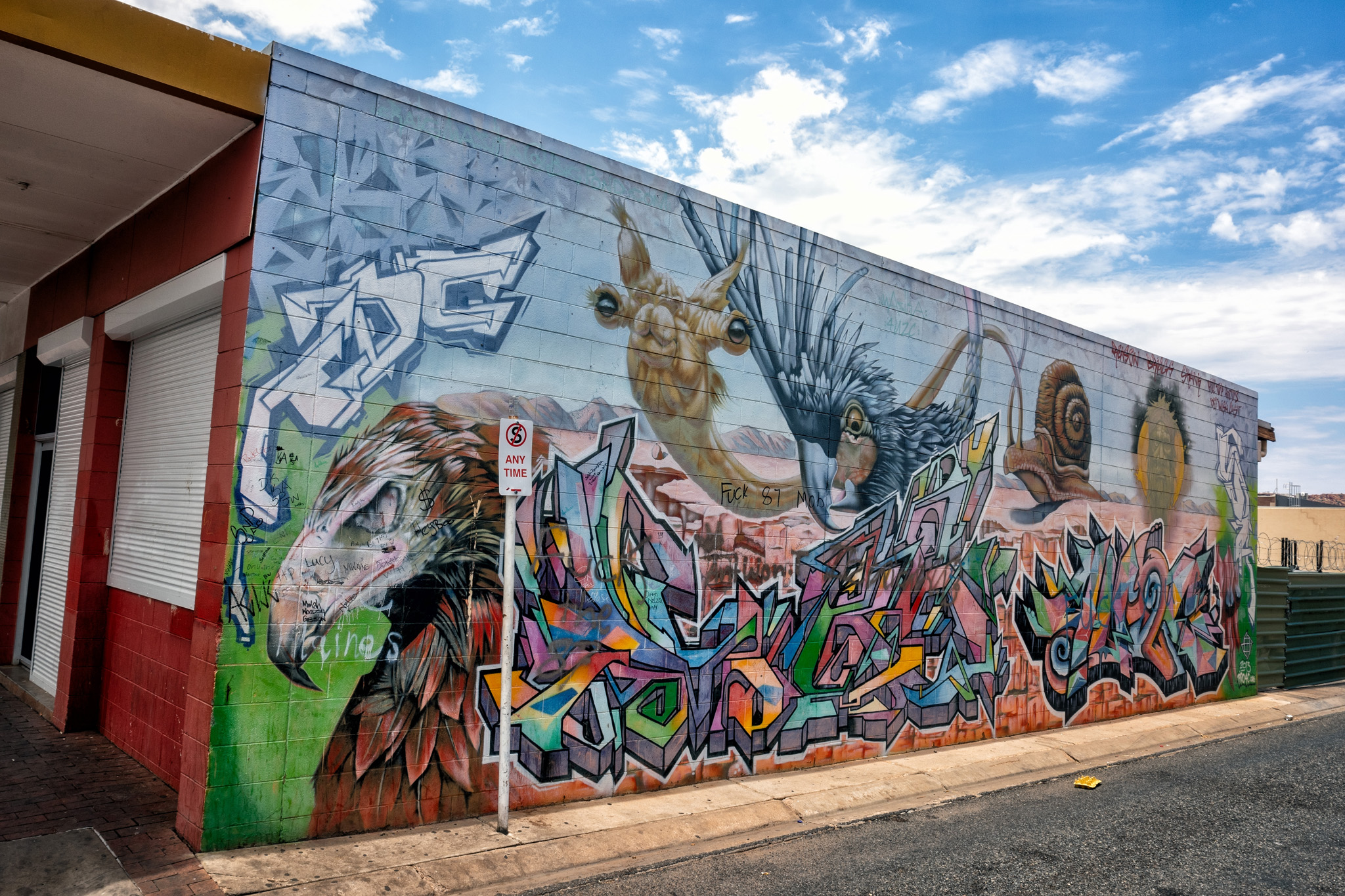 Alice Springs is a remote town in Australia’s Northern Territory, halfway between Darwin to the north and Adelaide to the south, both over 900 miles (1500 km) away. It’s a popular gateway for exploring the Red Center, the country’s interior desert region. A delayed flight meant only being able to explore a bit of downtown around where we had lunch. As tends to happen, I become a little obsessed with the street art in the area. All images created using the Leica CL with 18-56mm f/3.5-5.6 Vario-Elmar-T (27-84mm equivalent) lens. Processed using Photoshop CC with Nik Collection’s Color Efex Pro.
