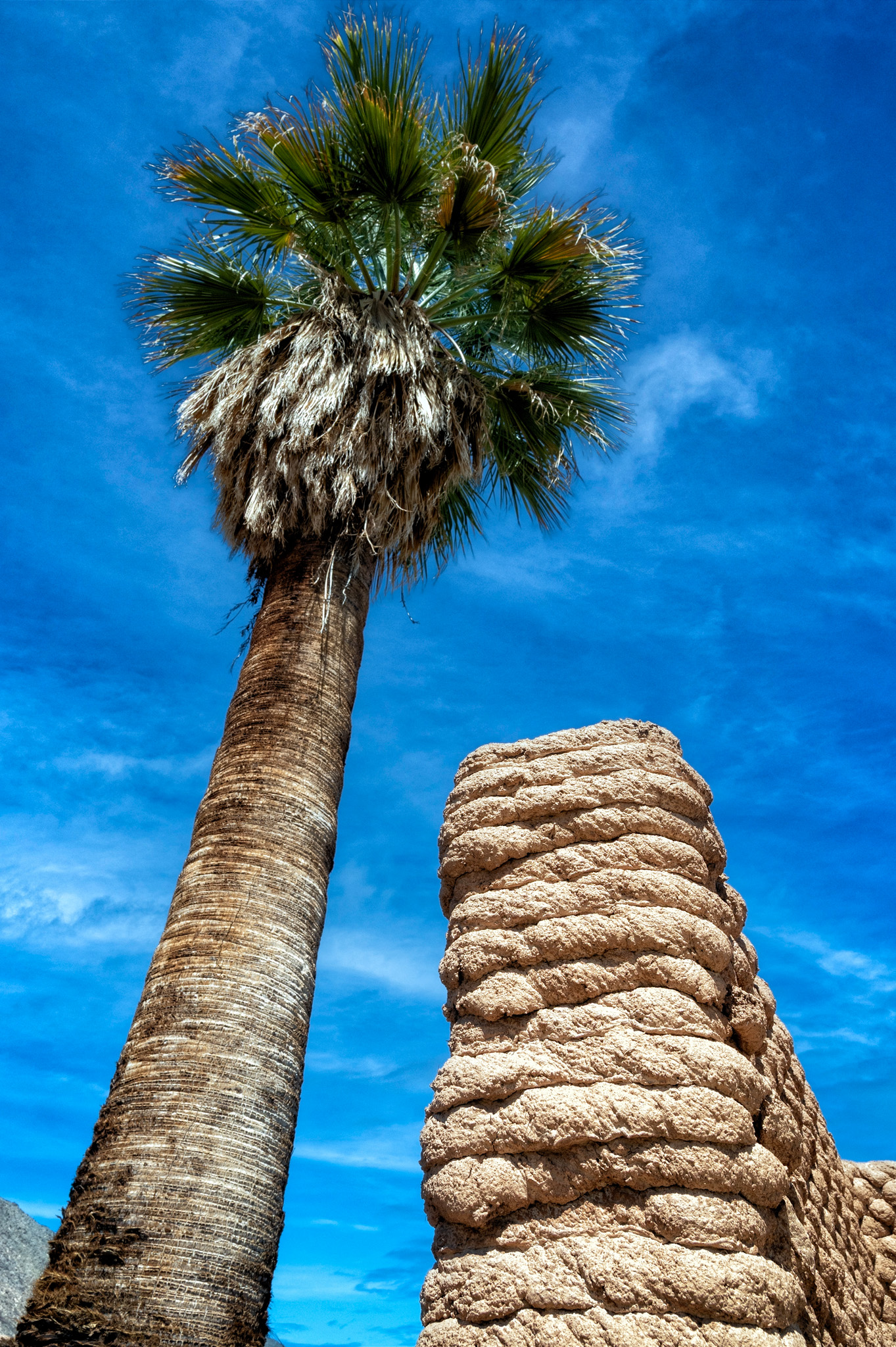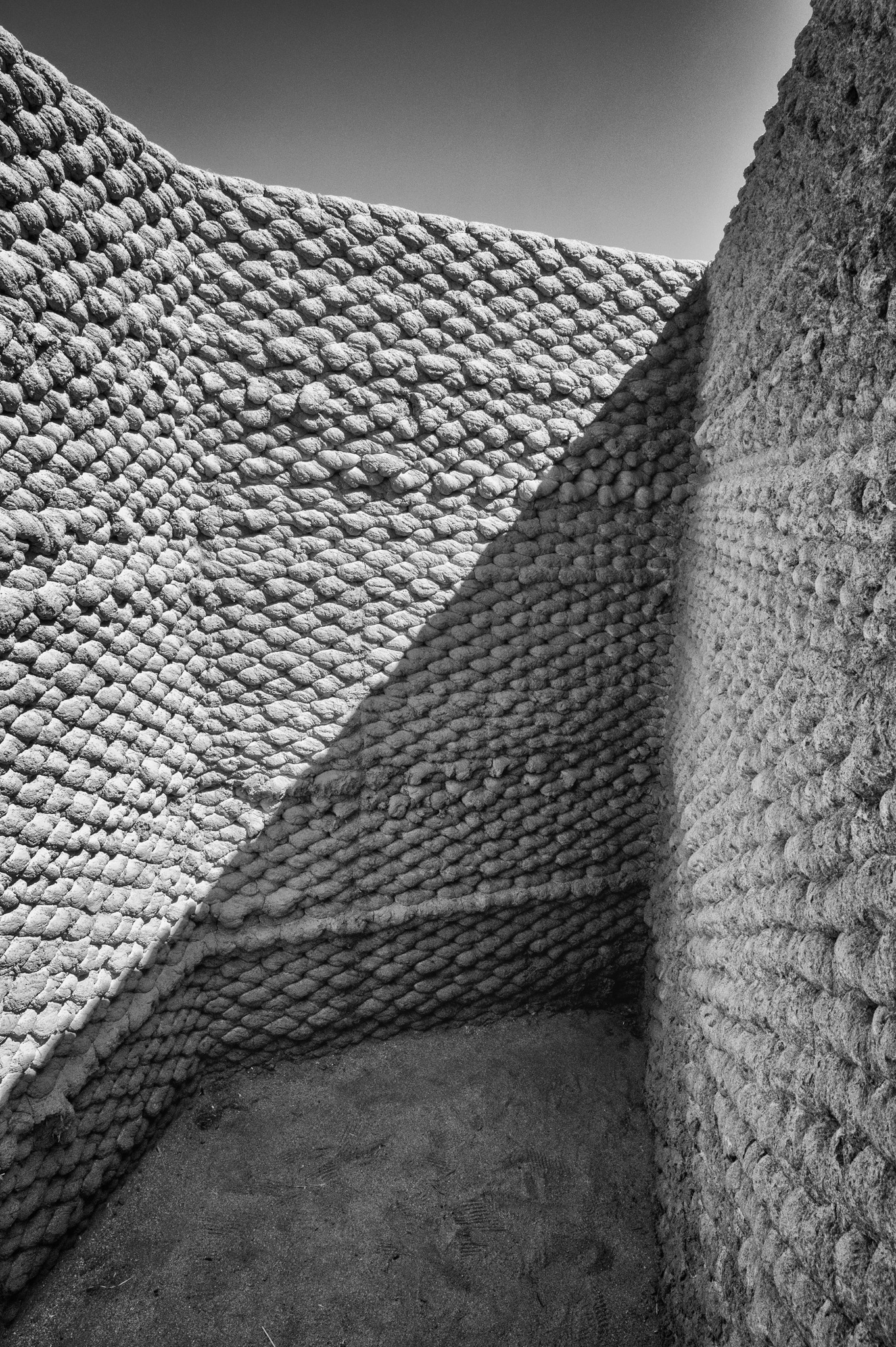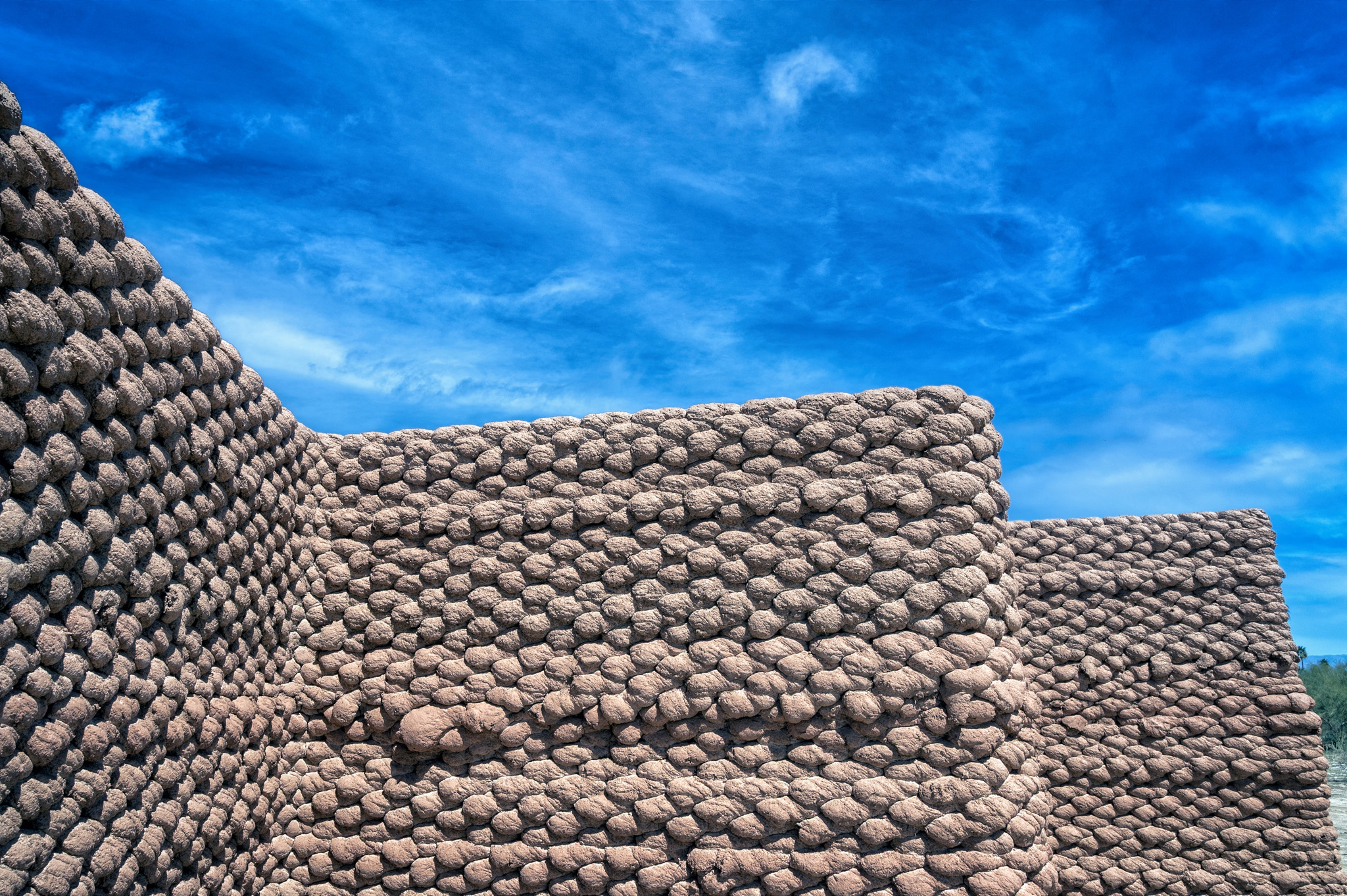Ronald Rael’s Adobe Oasis reimagines and revitalizes traditional yet overlooked earthen building techniques by merging them with contemporary technologies. Constructed through an innovative 3D-printing process that uses robotic programming to shape structures entirely from mud, Rael’s corrugated earthen ribbons echo the textured trunks of palm trees. Inspired by the enduring presence of Coachella Valley’s palm oases, the installation creates passageways that frame the land and sky, inviting moments of solitude and connection while embodying the cyclical rhythms of geologic time.