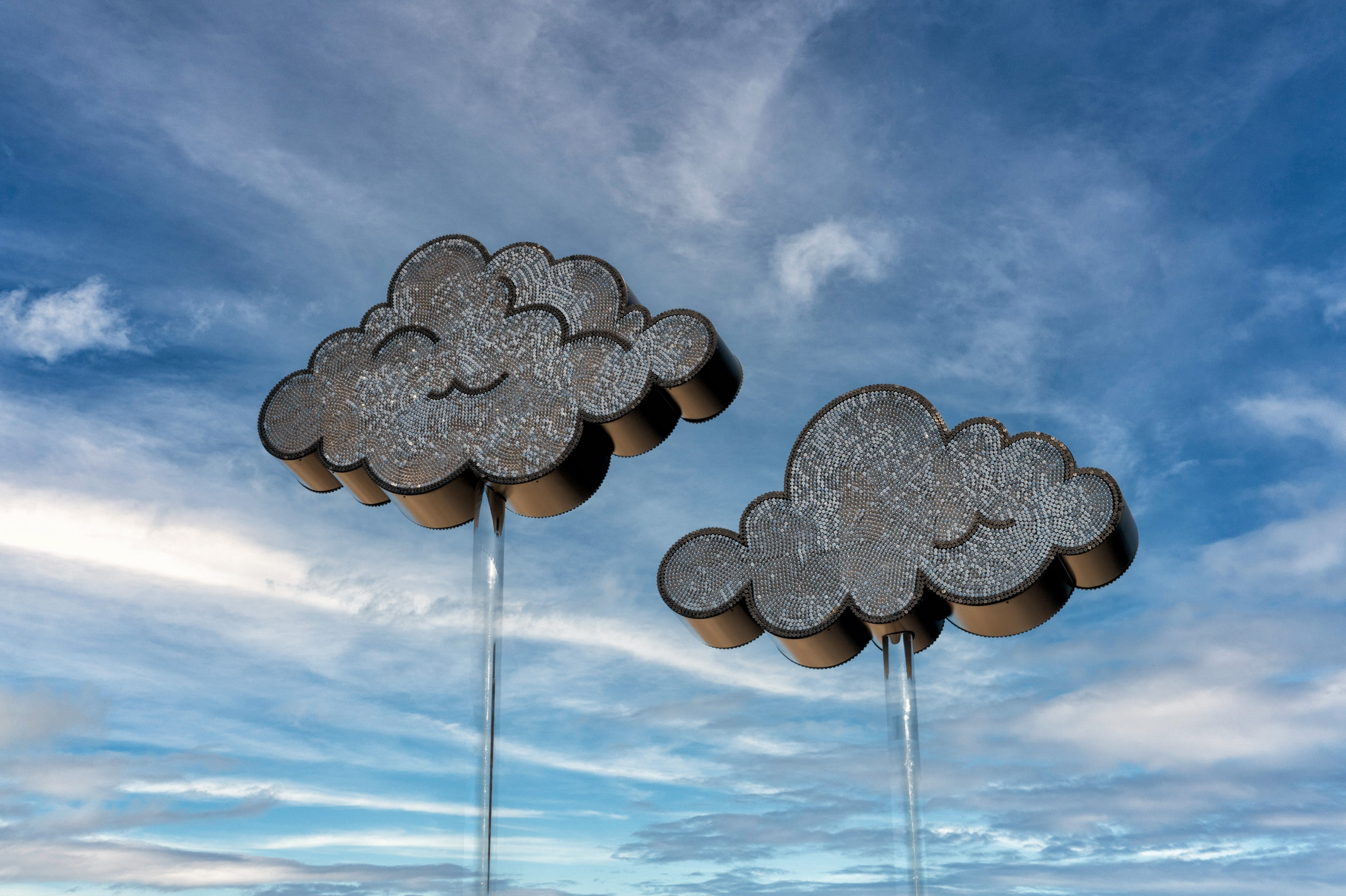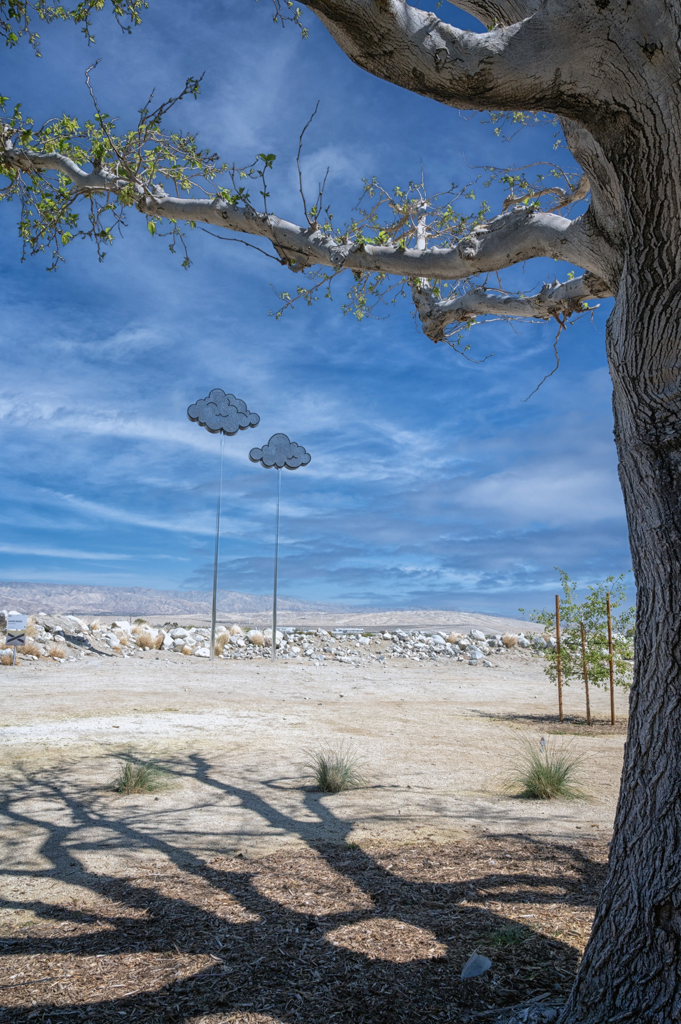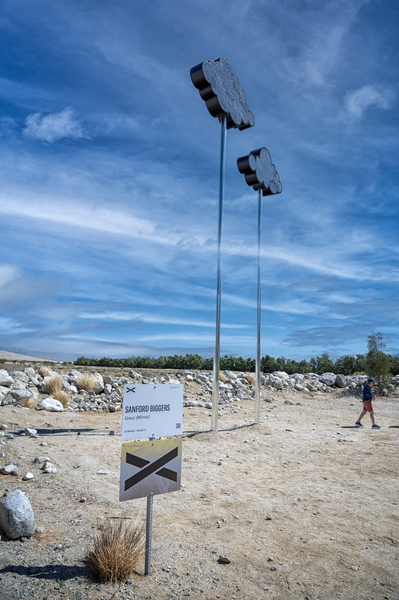 Sanford Biggers’s Unsui (Mirror) presents two towering sequin sculptures set against the vast desert sky. Clouds, a recurring motif in Biggers’s work, represent freedom, boundlessness, and interconnectedness. Rooted in the artist’s study of Buddhism, the title references unsui, a Japanese term meaning “clouds and water,” symbolizing fluidity and movement without constraint. Their presence in the arid landscape—where clear skies dominate—becomes a poignant gesture of hope, offering the promise of much-needed water in an environment shaped by its absence.