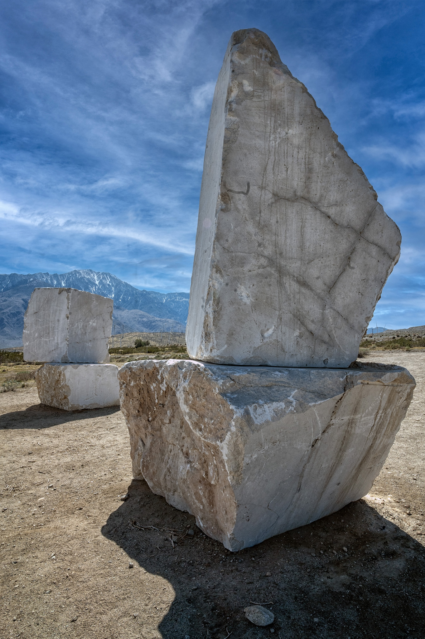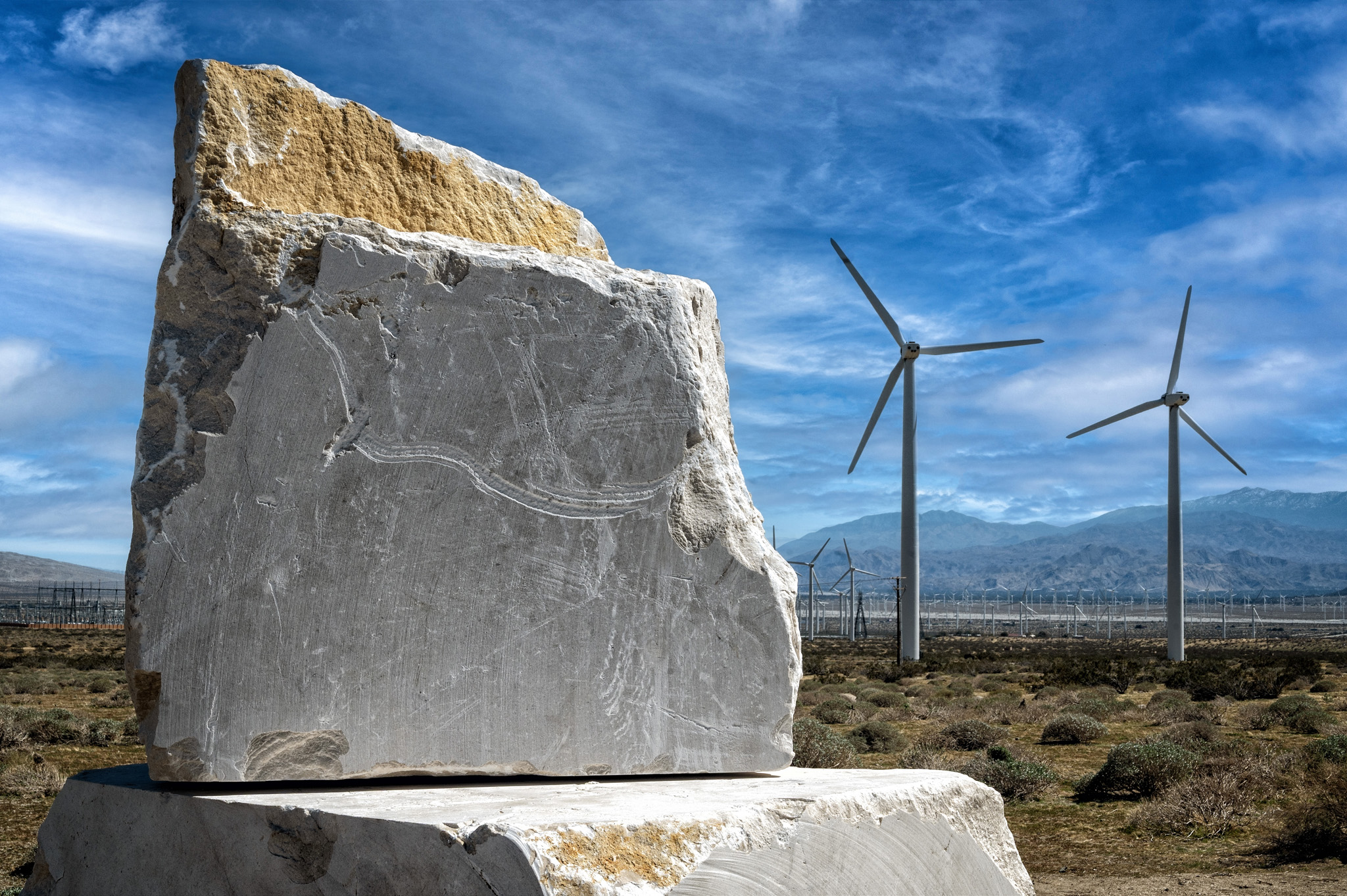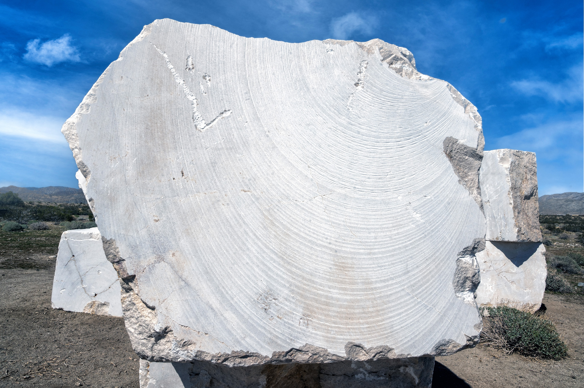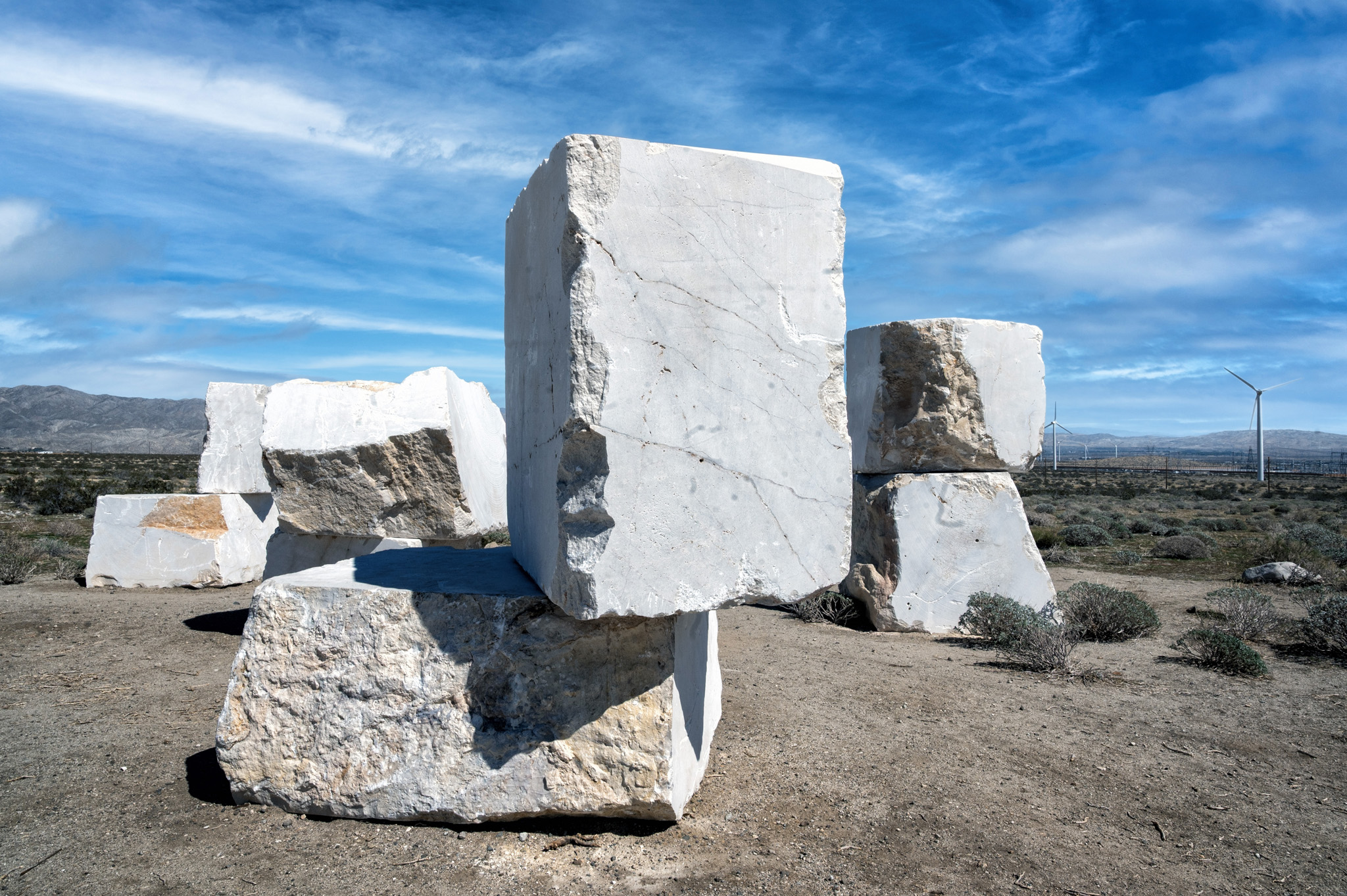 José Dávila’s The act of being together features massive, monolithic marble blocks that seem to fracture time and space. Dávila transported these stone blocks from a quarry just beyond the U.S.-Mexico border to the Coachella Valley, forging a connection between the two places by emphasizing the void they left behind and their striking presence in an unfamiliar landscape. Their journey is physical and symbolic—crossing national boundaries while navigating the liminal space between the seen and the unseen.