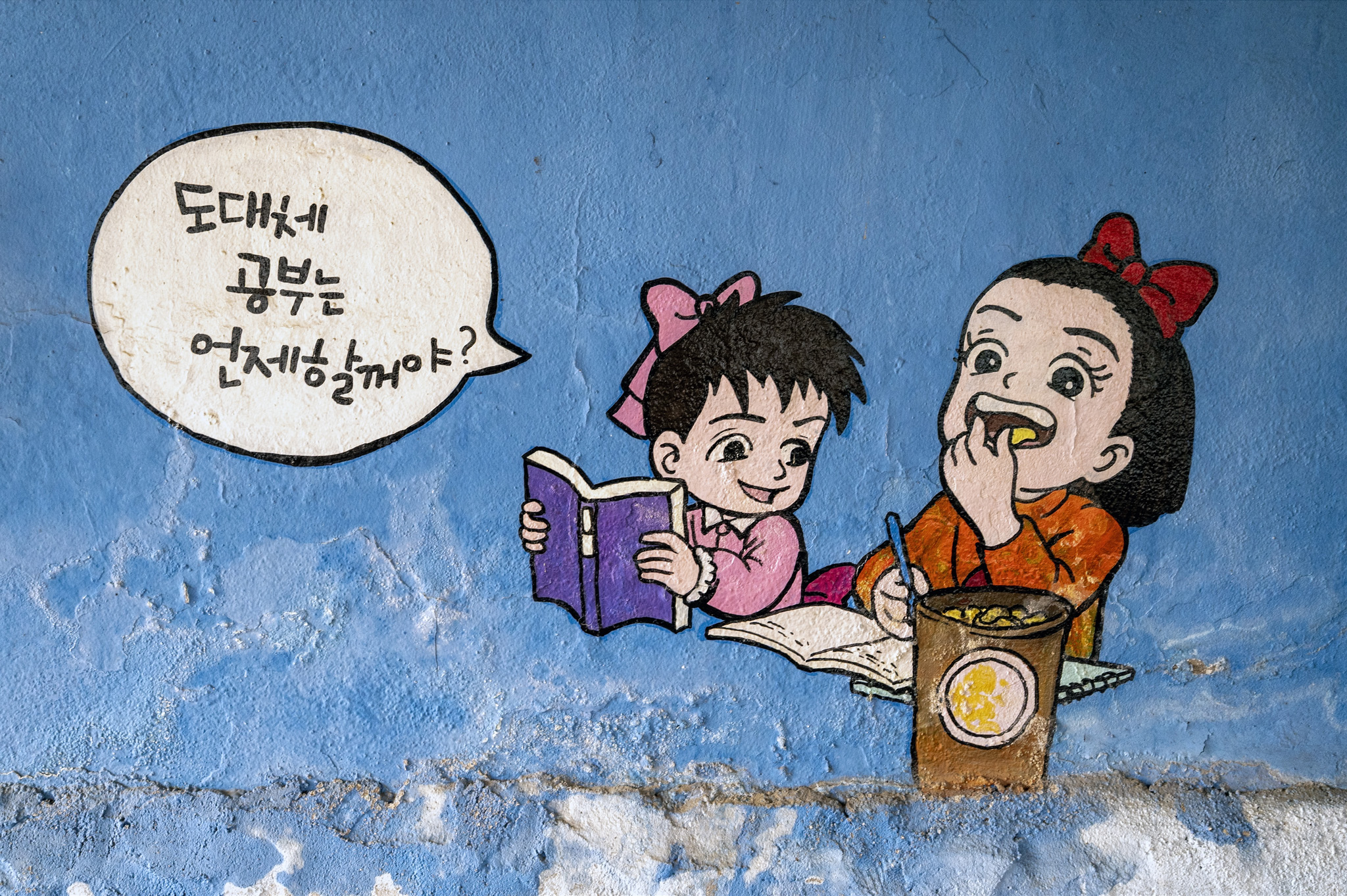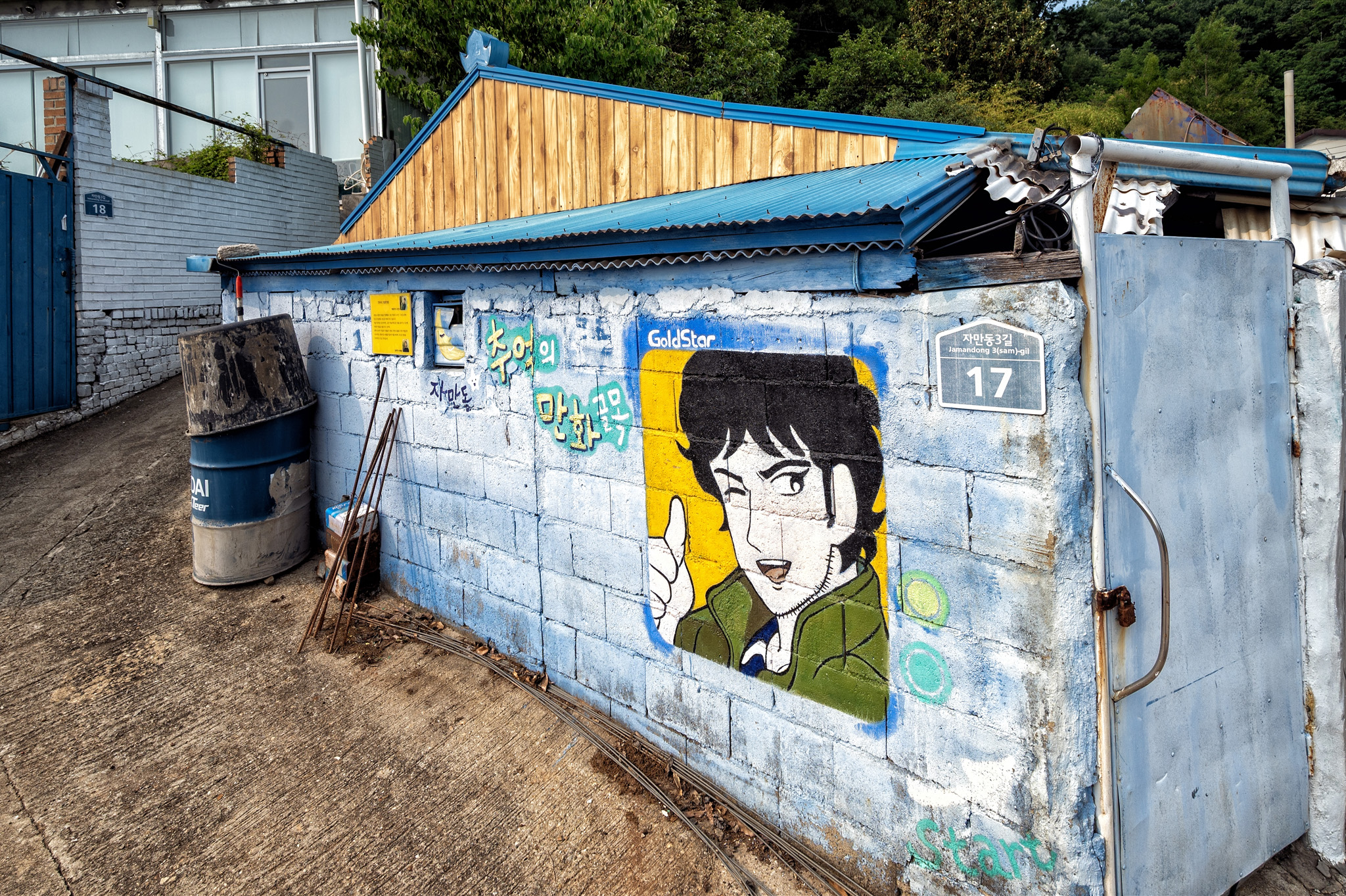 Walking through the village is like stepping into a dream. Every turn of the narrow path reveals a surprise: whimsical cartoons dancing across brick walls, scenes from beloved Korean dramas, and abstract expressions of joy and longing. The murals are not confined to walls alone—doors, staircases, and rooftops participate in the spectacle, blurring the line between architecture and art. They invite viewers to see not only the brilliance of the paintings, but also the soul of a community reclaiming its identity through creativity. All photos created with the Nikon Z6 and either the 14-30mm f/4 or 24-70mm f/4 lens. Processed using Photoshop CC and Nik Collection’s Color Efex Pro.
