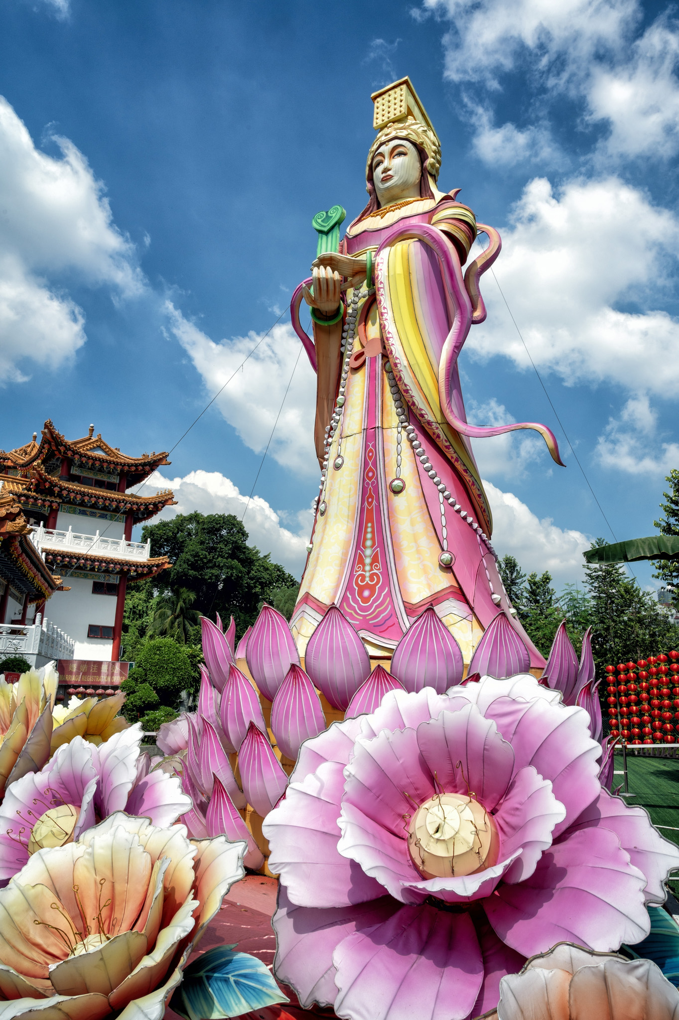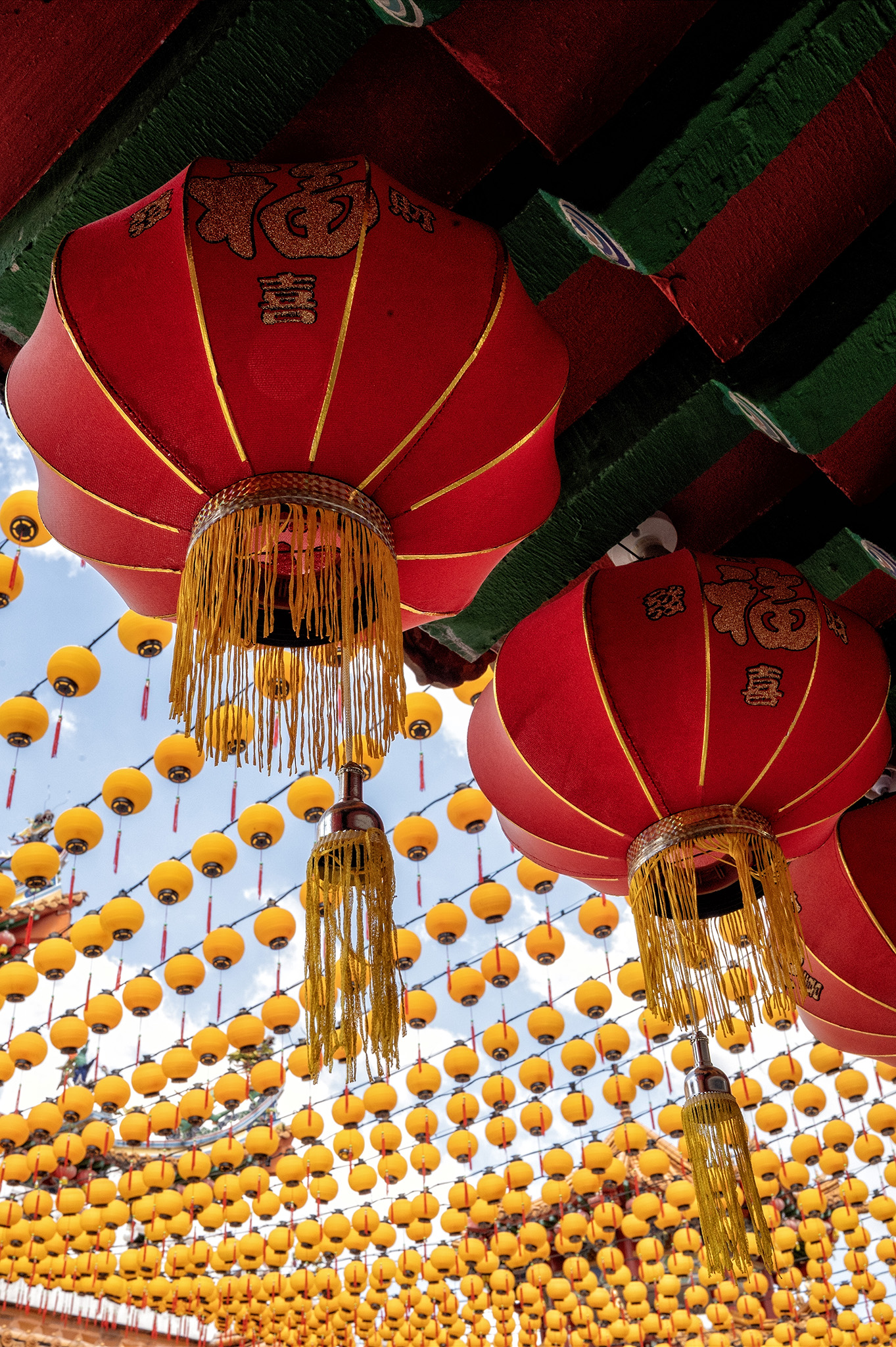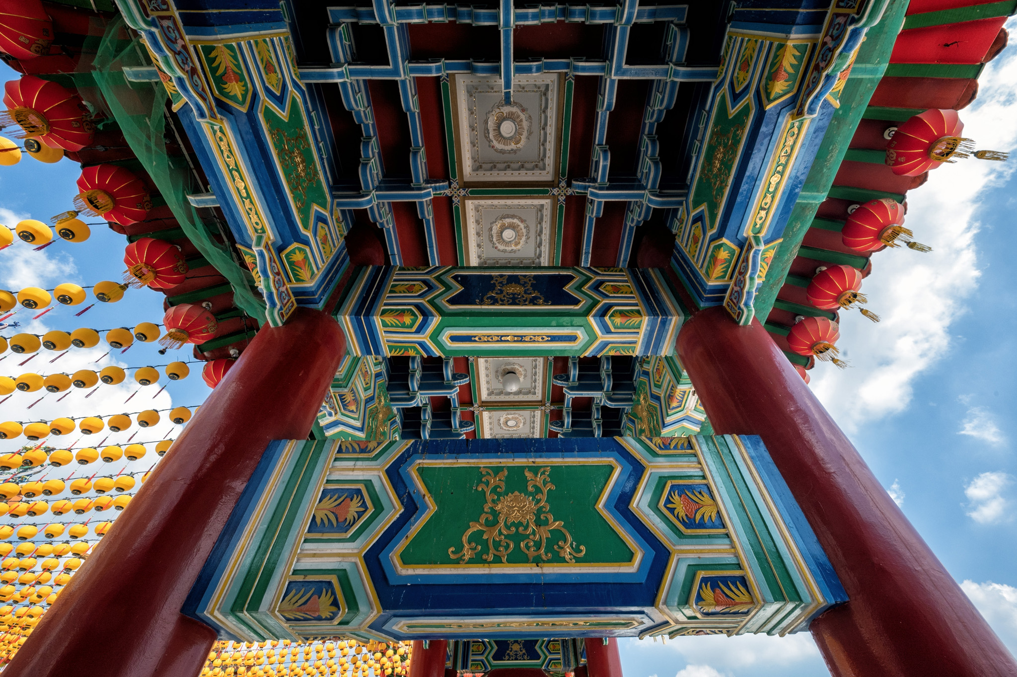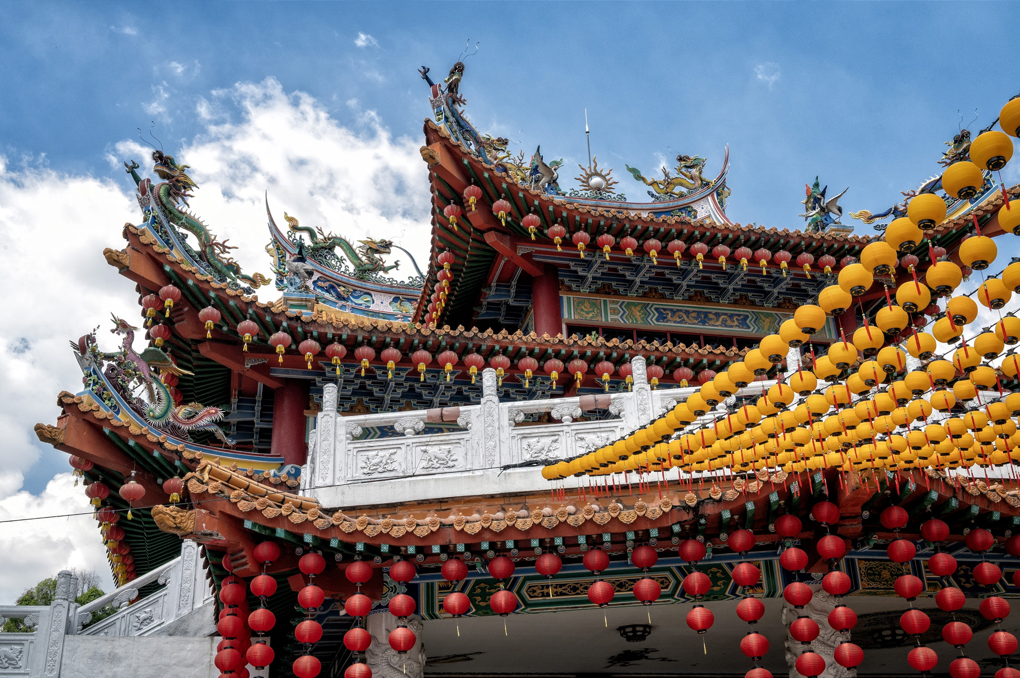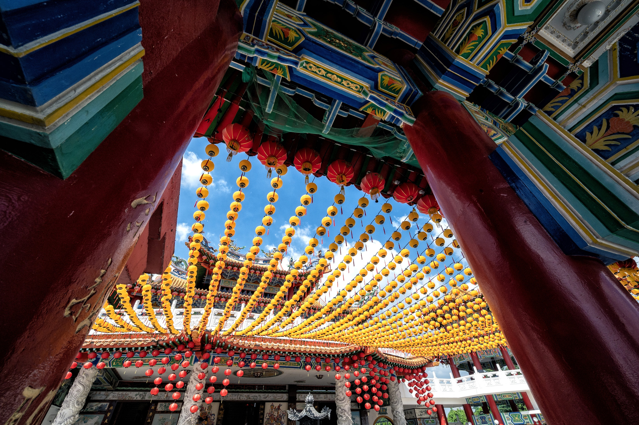 Architecturally, Thean Hou Temple is a striking blend of traditional Chinese design and modern construction techniques. Its multi-tiered, pagoda-style roofs are adorned with intricate carvings of dragons and phoenixes, while the main prayer hall houses statues of the deities set against elaborately decorated altars. Red lanterns, particularly abundant during Chinese New Year, drape the temple grounds and create a festive, luminous atmosphere. All photos created with the Nikon Z6 and either the 14-30mm f/4 or 24-70mm f/4 lens. Processed using Photoshop CC and Nik Collection’s Color or Silver Efex Pro.