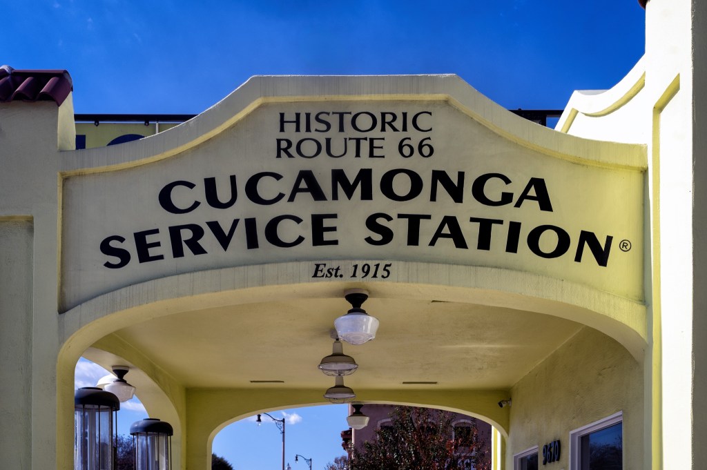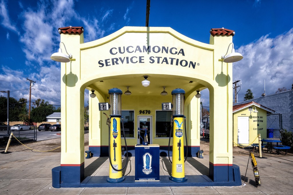 The Cucamonga Service Station is a well-preserved historic landmark along historic Route 66 in Rancho Cucamonga, California. Built in 1915, it predates the official designation of Route 66 by more than a decade, making it one of the oldest surviving service stations associated with the famed highway. Architecturally, the building is notable for its Spanish Colonial Revival style, a design common in Southern California during the early 20th century. Its stucco walls, tiled columns, and canopy evoke a time when service stations were intentionally designed to appear welcoming and regionally distinctive rather than purely utilitarian.