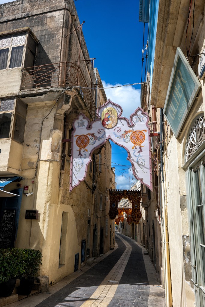 Rabat is a historic town located just outside the old capital of Mdina, in the central part of the island of Malta. Its name comes from the Arabic word for “suburb,” reflecting its origins as the settlement that grew beyond Mdina’s fortified walls during the medieval period. Today, Rabat is known for its quieter, more residential atmosphere compared to Mdina, while still offering a rich blend of cultural and historical attractions. I’m here in mid-March, when town is decorated with banners and flags in preparation for the celebration of the Feast of St. Joseph, the town’s patron saint.