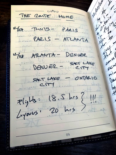 The day of my returning flights starts off well. That evening I said goodbye to my future wife and we exchange contact information. My flight from Tunis to Paris departs and arrives on time. I make it through security in Paris and find my gate. Thanks to recent events, security is high and at the gate shoes and jackets are removed, passengers are frisked front and back, and large carry-ons are checked and smaller carry-ons are thoroughly searched. Subsequently, we arrive in Atlanta late and I find I’ve just missed my connecting flight. So it’s another day living out of my day pack. I contact the airline to see if they can put me up for the night but as the delay was not their fault, they can only offer me a new flight the following day. As for accommodation, I’m on my own. I head for the hotel shuttles and find one to what I know is a reasonably priced hotel. Fortunately, the receptionist takes pity on me and puts together a toiletry assortment.