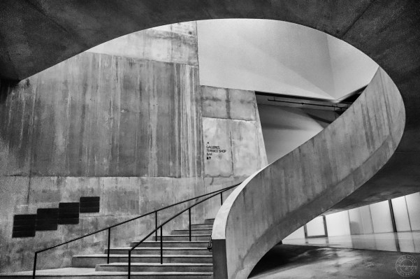 Mild panic over, I try a new approach: If I were designing the gallery and wanted to put in a spiral staircase, where would I put it? Answer: the ground floor. So, I head back down to the ground floor and this time, not being distracted by the slit windows, easily find the staircase. Most images I’ve seen include a solo person in a prime spot in a well composed shot, though I sometimes suspect it’s the photographer’s spouse or friend. I focus more on images without people as I’m more interested in the shadows and curves.